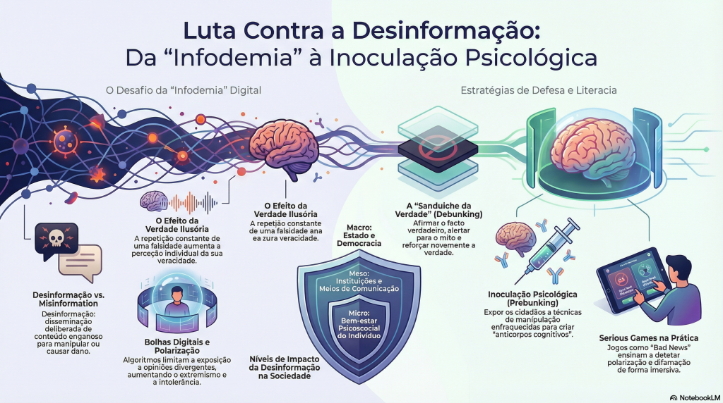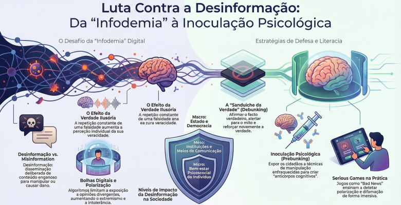 A proliferação do ecossistema digital democratizou o acesso à informação, mas trouxe consigo o desafio sistémico da desinformação, que ameaça as sociedades democráticas e o bem-estar psicossocial dos indivíduos (Ordem dos Psicólogos Portugueses [OPP], 2025). Este artigo explora o impacto da desinformação nas esferas individual, institucional e social, analisando as tendências científicas atuais para o seu combate (Media Literacy, 2024). Focando-se na literacia mediática, o estudo destaca intervenções baseadas na Ciência Psicológica, especificamente as estratégias de debunking e de inoculação psicológica (prebunking) através de Serious Games (American Psychological Association [APA], 2023; Silva, 2024). Conclui-se que o combate à desinformação exige uma abordagem multidimensional, onde a educação e a literacia atuam como pilar para promover o pensamento crítico e a resiliência da população (Silveira & Morais, 2021).