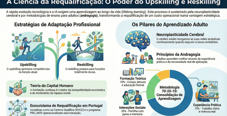 A revolução tecnológica e a rápida integração da inteligência artificial (IA) estão a transformar o mercado de trabalho a um ritmo sem precedentes, exigindo uma readaptação constante dos profissionais. Neste cenário contemporâneo, o paradigma tradicional de estudar apenas durante a juventude ou uma única vez na vida já não é suficiente, tornando a aprendizagem ao longo da vida (lifelong learning) uma necessidade absoluta para a permanência e sustentabilidade económica no mercado. É perante esta exigência estrutural que os conceitos de upskilling e reskilling assumem um protagonismo inegável na atual gestão de talentos.