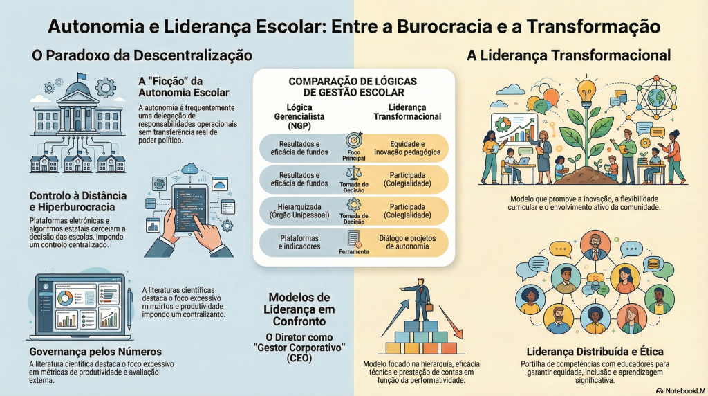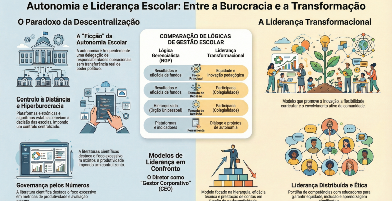 A autonomia das escolas encontra-se num espaço ambíguo, imprensada entre as narrativas libertadoras da descentralização e as práticas neoburocráticas e avaliativas da administração estatal. Para romper este cerco, a governação e a liderança escolar não podem esgotar-se num mero exercício gerencial de submissão a plataformas e indicadores estatísticos; antes, necessitam de assumir uma vocação transformacional e ética, fundamentada na construção participada de um currículo centrado na igualdade de oportunidades para todos os alunos.