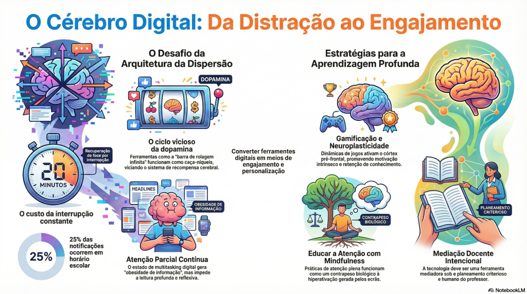 A Arquitetura da Dispersão e o Sequestro da Atenção O cérebro humano é naturalmente atraído por novidades e recompensas, sendo guiado pelo sistema dopaminérgico (Soares, 2025). As tecnologias digitais, especialmente os smartphones e as redes sociais, exploram esta vulnerabilidade neurológica de forma meticulosa. Funcionalidades como a “barra de rolagem infinita” atuam como uma máquina caça-níqueis, gerando a expectativa de libertação de dopamina a cada novo conteúdo, o que mantém o utilizador num ciclo viciante (Xavier, 2022).